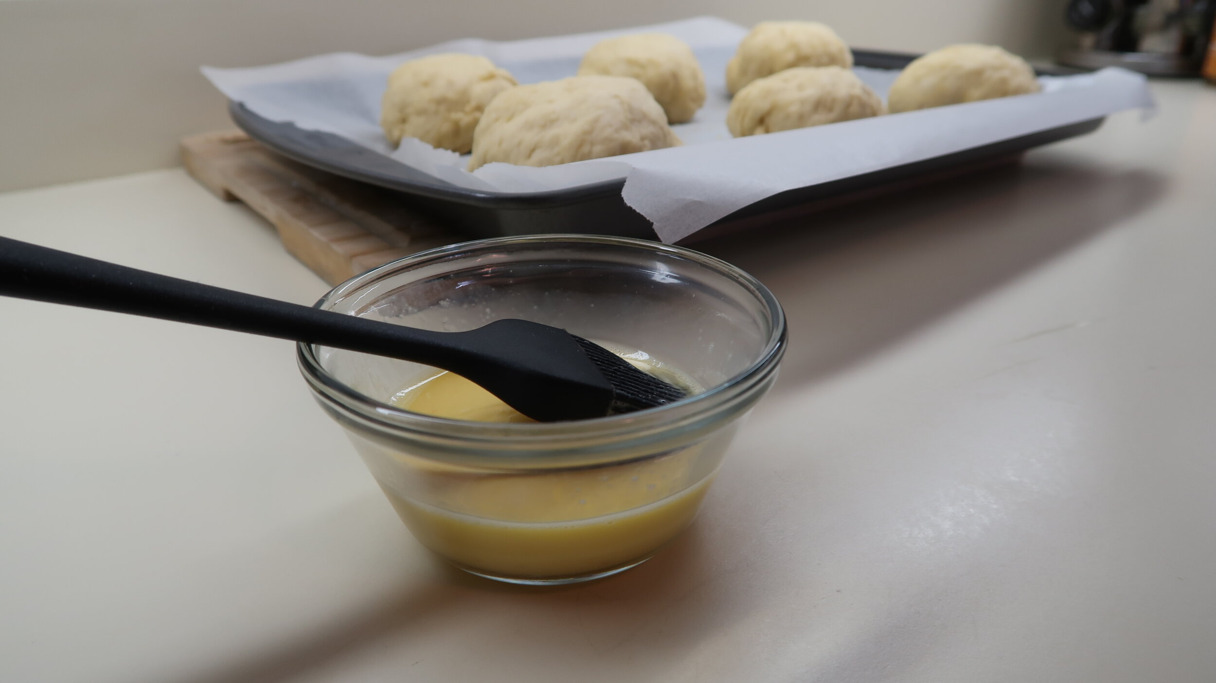 Brush the entire top of the buns with egg wash (whisk egg and milk in a small bowl). Bake at 375 for 16-18 minutes until golden brown. Brush with melted butter & let cool in a wire rack.